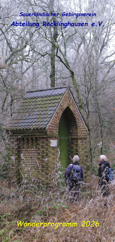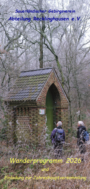 Die SGV-Abteilung Recklinghausen überreicht Ihnen ihren Veranstaltungskalender in der Hoffnung und mit dem Wunsch, dass ihre Wanderungen und Veranstaltungen viele Möglichkeiten zu einer positiven Freizeitgestaltung öffnen. Der vorliegende Wander- und Veranstaltungsplan bezieht sich auf das Jahr 2026.